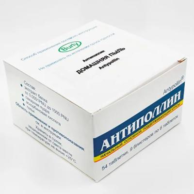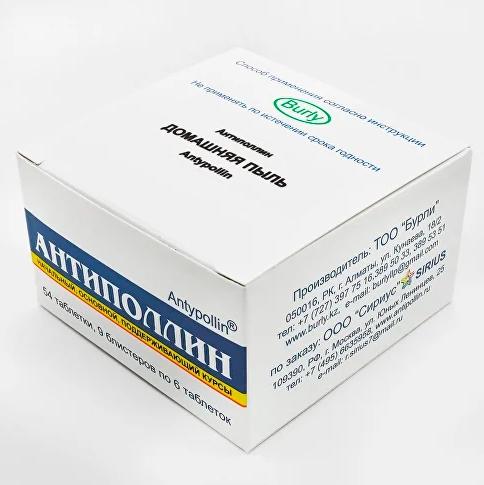 «Антиполлин» — таблетированный препарат из российских и казахстанских аллергенов, предназначен для иммунопрофилактики аллергических заболеваний: ринита, конъюнктивита, бронхиальной астмы, атипического дерматита, вызванных гиперчувствительностью к аллергенам.