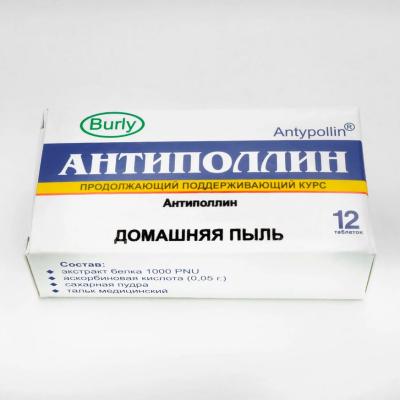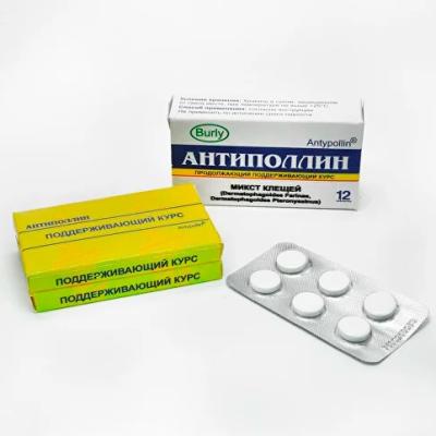 «Антиполлин» — таблетированный препарат из российских и казахстанских аллергенов, предназначен для иммунопрофилактики аллергических заболеваний: ринита, конъюнктивита, бронхиальной астмы, атипического дерматита, вызванных гиперчувствительностью к аллергенам.